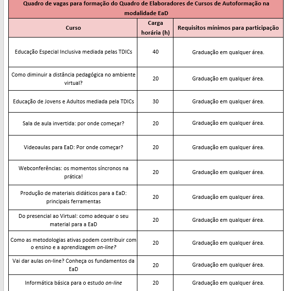As vagas para participação do quadro de elaboradores de cursos de autoformação na modalidade EaD serão preenchidas conforme a necessidade apresentada pela Diretoria de Educação a Distância da Proen. Confira o quadro de vagas:
