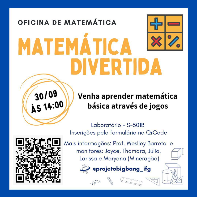 Estudantes dos cursos técnicos integrados do Câmpus Goiânia do Instituto Federal de Goiás podem se inscrever para participar do projeto de ensino Big Bang. A proposta, que partiu de um grupo de professores do Departamento de Áreas Acadêmicas 2, oferta oficinas quinzenais aos discentes, visando a recuperação de conteúdos práticos e teóricos que ficaram prejudicados durante o ensino remoto emergencial. O tema trabalhado nessa semana, no dia 30 de setembro será, Matemática Divertida. As inscrições devem ser realizadas aqui. São 20 vagas disponíveis.