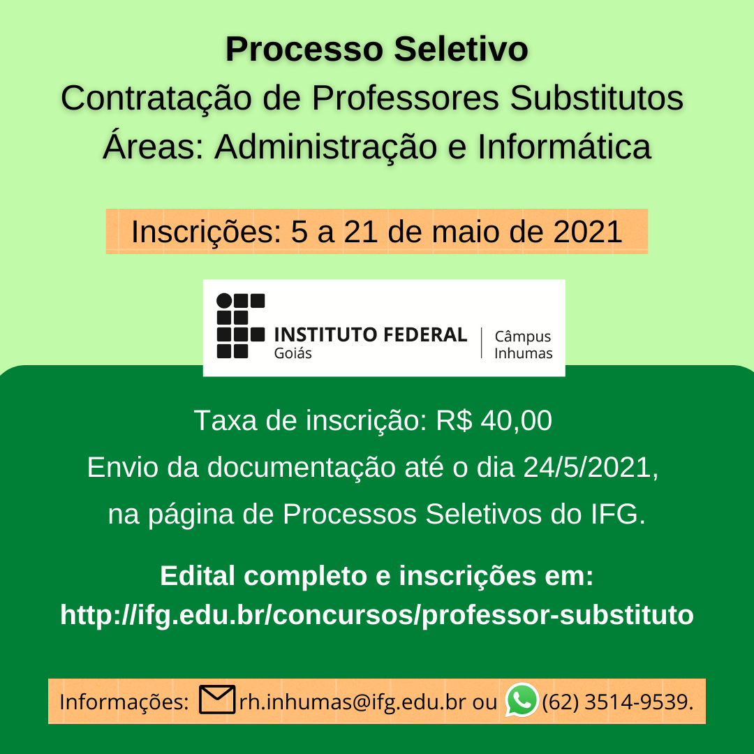 Estão abertas, até 21 de maio, as inscrições do processo seletivo para contratação de professores substitutos, nas áreas de Administração e Informática, no IFG-Câmpus Inhumas. A taxa de inscrição tem o valor de R$ 40,00 e o envio da documentação exigida no edital poderá ser realizado até o dia 24 de maio.