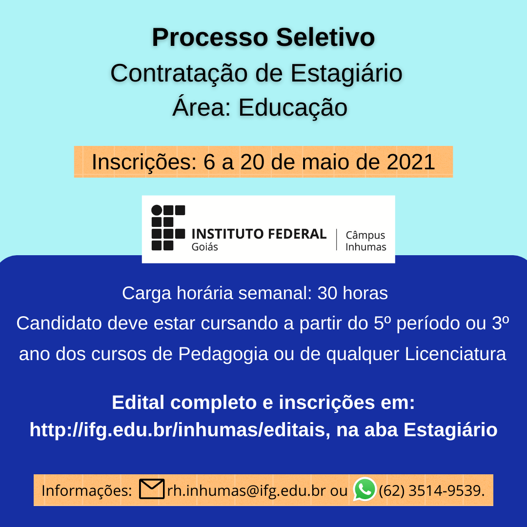 Estão abertas, até 20 de maio, as inscrições para a seleção de um estagiário (e formação de cadastro reserva), da área de Educação, para atuar no IFG-Câmpus Inhumas. As inscrições são gratuitas e o candidato deve estar cursando a partir do 5º período ou 3º ano dos cursos de Pedagogia ou de qualquer Licenciatura.