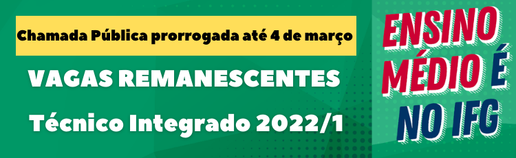 Foi prorrogado, até o dia 4 de março, o prazo do edital de chamada pública para vagas remanescentes nos cursos Técnicos Integrados ao Ensino Médio no IFG-Câmpus Inhumas, para o primeiro semestre do ano letivo de 2022. O interessado deverá dirigir-se ao câmpus, de segunda a sexta, das 7h às 12h, portando a documentação exigida na chamada pública (Item 8). O estudante participará de uma entrevista na Coordenação de Registros Acadêmicos e Escolares (CORAE) e será encaminhado para matrícula. Todas as informações estão disponíveis em www.ifg.edu.br/selecao > Seleções em Andamento > Técnico Integrado.