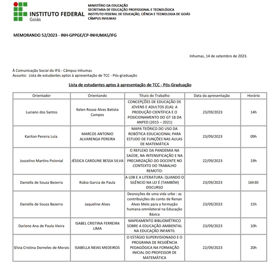 A Gerência de Pesquisa, Pós-Graduação e Extensão do IFG-Câmpus Inhumas publicou a lista de estudantes da Especialização em Docência na Educação Básica e Profissional aptos a defender o Trabalho de Conclusão de Curso (TCC). As defesas serão realizadas nos dias 22 e 23 de setembro de 2023 e poderão ser acompanhadas de forma presencial e também de modo on-line, por meio de links que serão divulgados posteriormente pelos professores orientadores.