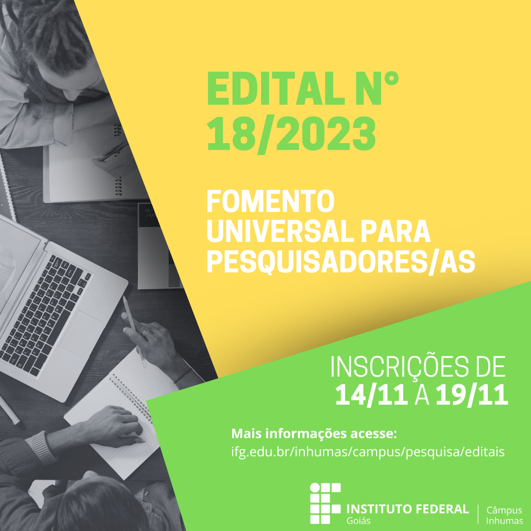 A Gerência de Pesquisa, Pós-Graduação e Extensão do IFG-Câmpus Inhumas informa que estão abertas as inscrições para o Edital 18/2023/GEPEX/INH de Fomento Universal para Pesquisadores(as). As inscrições devem ser realizadas até o dia 19 de novembro pelo site do SUAP: https://suap.ifg.edu.br/