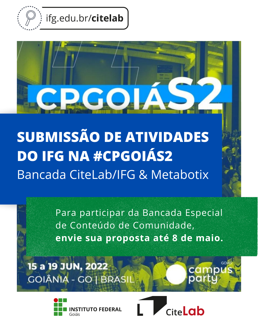 De acordo com a Coordenação do Eixo de Design Factory do CiteLab, o IFG terá uma bancada especial de conteúdos durante a segunda edição da Campus Party Goiás. O evento acontecerá presencialmente entre os dias 15 e 19 de junho, no Shopping Passeio das Águas, em Goiânia. Os conteúdos do IFG serão apresentados entre os dias 16 e 18 de junho.