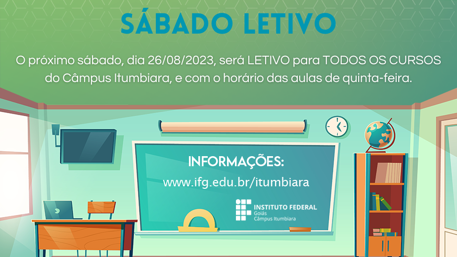 Conforme Calendário Acadêmico, o Departamento de Áreas Acadêmicas informa que este próximo sábado, dia 26/08/2023, será letivo com o horário de aulas da QUINTA-FEIRA, para todos os cursos. Considerando os problemas de disponibilidade de espaço físico no Câmpus, os quais são insuficientes para acomodar todas as turmas dos turnos vespertino e noturno, os espaços serão organizados da seguinte forma: