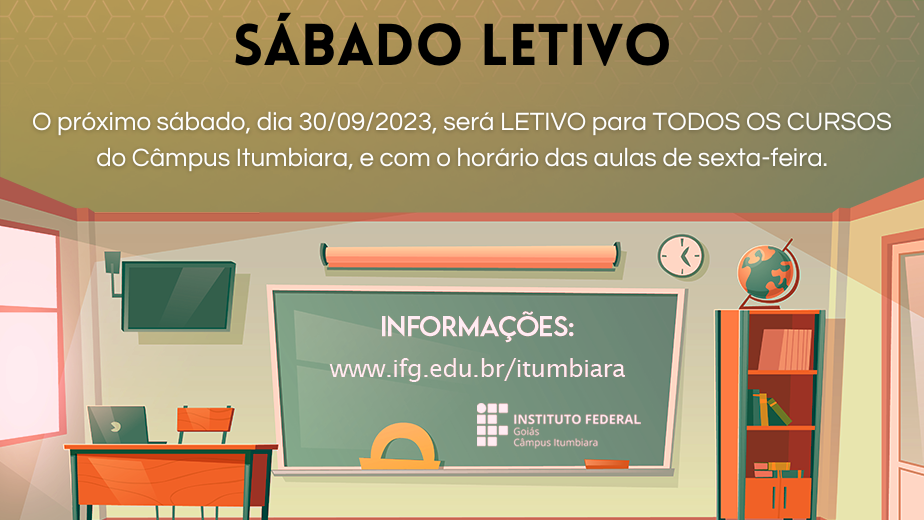 Conforme Calendário Acadêmico, o Departamento de Áreas Acadêmicas informa que este próximo sábado, dia 30/09/2023, será letivo com o horário de aulas da SEXTA-FEIRA, para todos os cursos. Considerando os problemas de disponibilidade de espaço físico no Câmpus, os quais são insuficientes para acomodar todas as turmas dos turnos vespertino e noturno, os espaços serão organizados da seguinte forma: