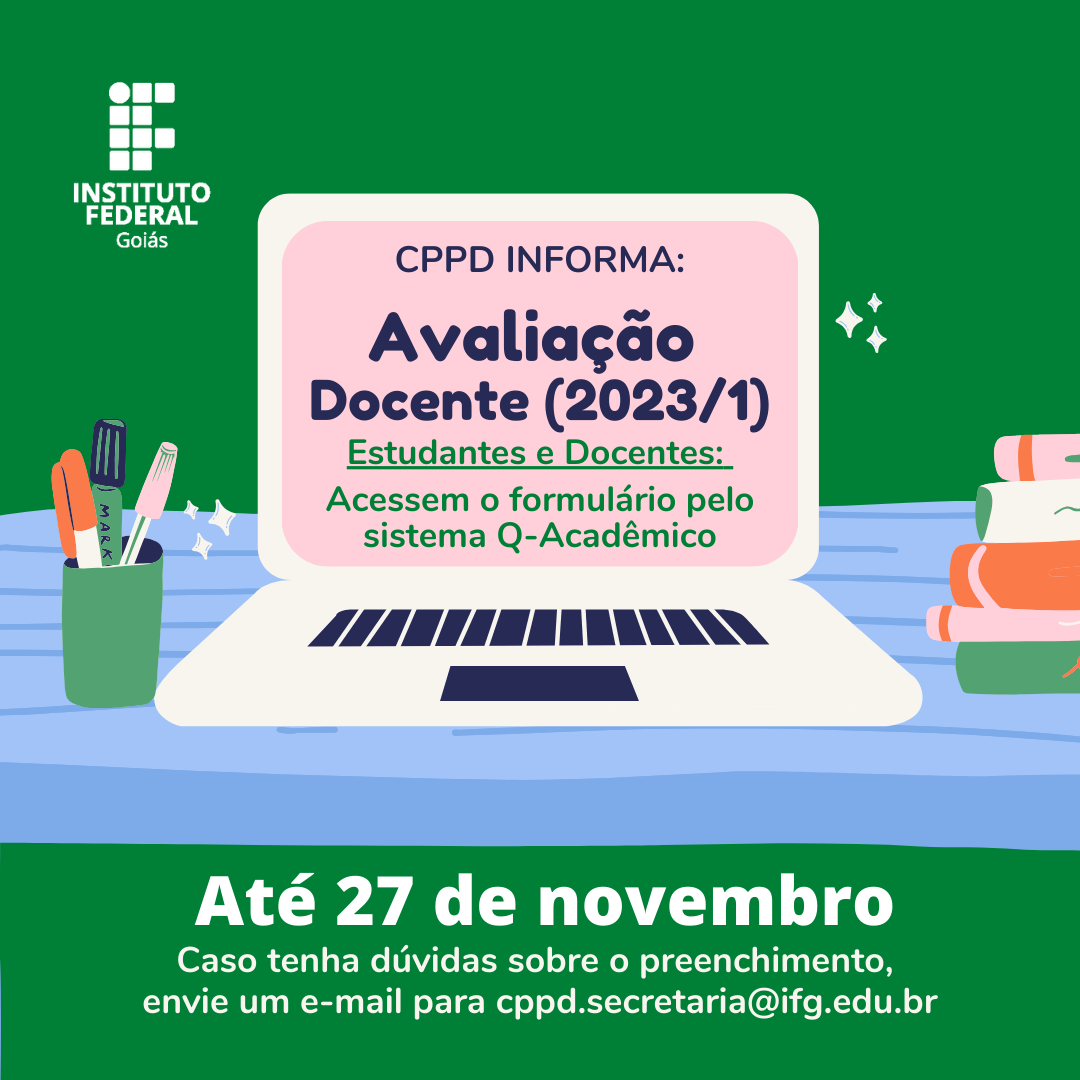 O Instituto federal de Goiás (IFG), por meio da sua Comissão Permanente de Pessoal Docente (CPRO), disponibilizou no dia 06 de novembro, o questionário de autoavaliação e avaliação docente referente ao período de 2023-1 o prazo para que estudantes e professores(as] da Instituição respondam os questionários encerra-se no dia 27 de novembro.