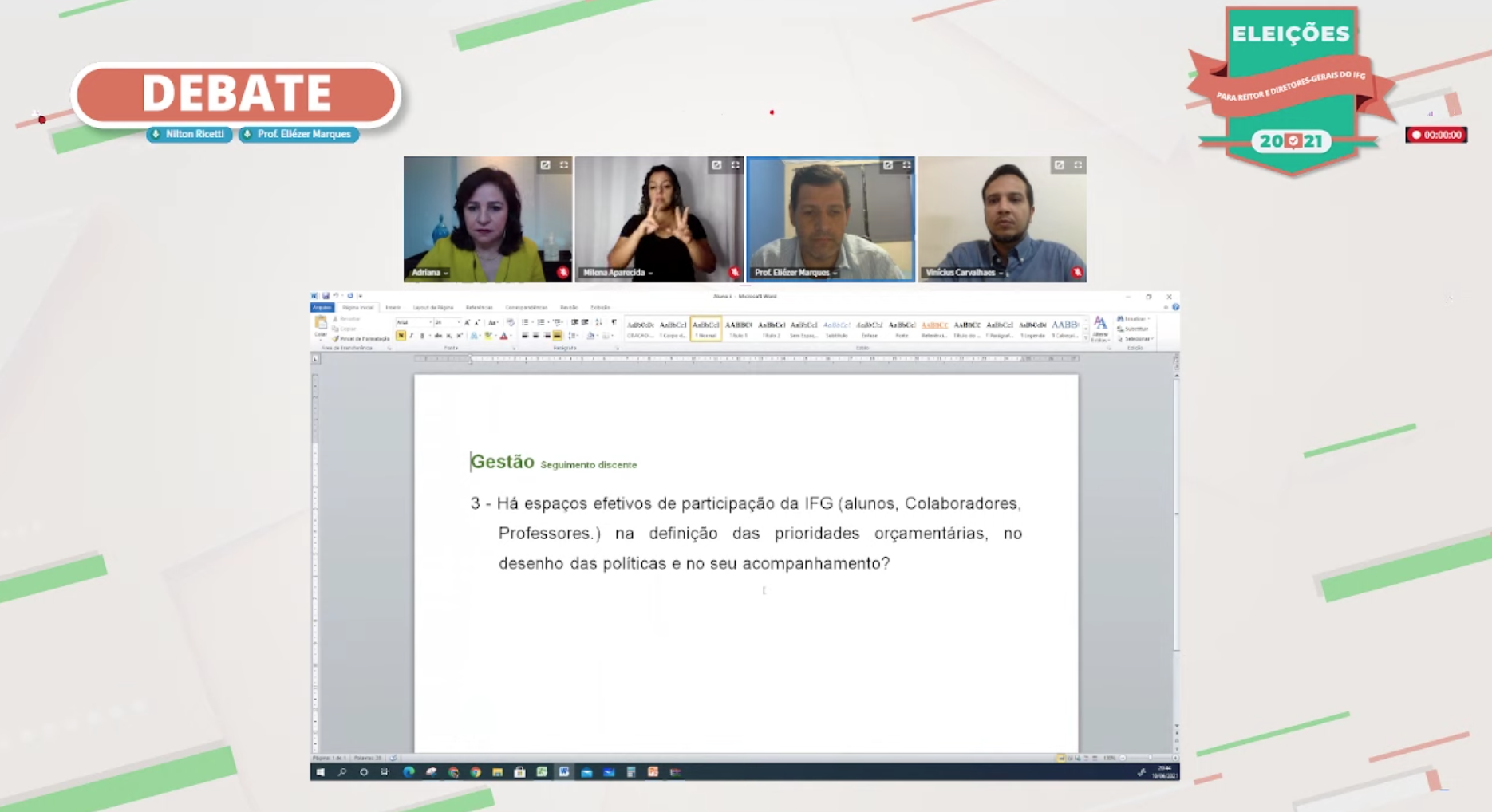 A transmissão foi iniciada pelo professor e membro da comissão eleitoral, Nilton Ricetti, presidente da Comissão Local, que fez agradecimentos à equipe técnica que tornou o debate online possível. Em seguida, a palavra foi passada ao professor Weber Tavares, também componente da comissão, que externou suas condolências às famílias que perderam pessoas devido à Covid-19 e reforçou a importância de participar de um momento como o debate, em que a comunidade acadêmica pode escolher democraticamente seus representantes.