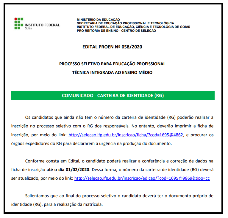 Processo Seletivo - cursos técnicos - DOCUMENTO DE IDENTIDADE
