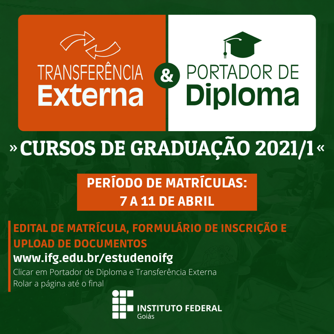 Para edital de matrícula, formulário de inscrição, upload de documentos e orientações, acesse http://ifg.edu.br/estude-no-ifg/selecoes-em-andamento/portador-de-diploma-e-transferencia-externa e role a página até o fim.