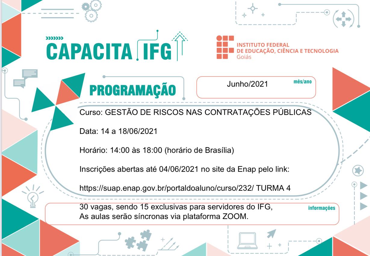Estão abertas as inscrições para o curso Gestão de Riscos nas Contratações Públicas, ofertado pelo Programa Capacita IFG da Pró-Reitoria de Desenvolvimento Institucional e Recursos Humanos em parceria com a Escola Nacional de Administração Pública.