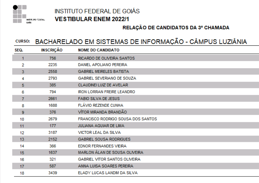 Confira os convocados em: http://selecao.ifg.edu.br/downloads/cod1822/chamada.3.vestibular.enem.luziania.pdf
