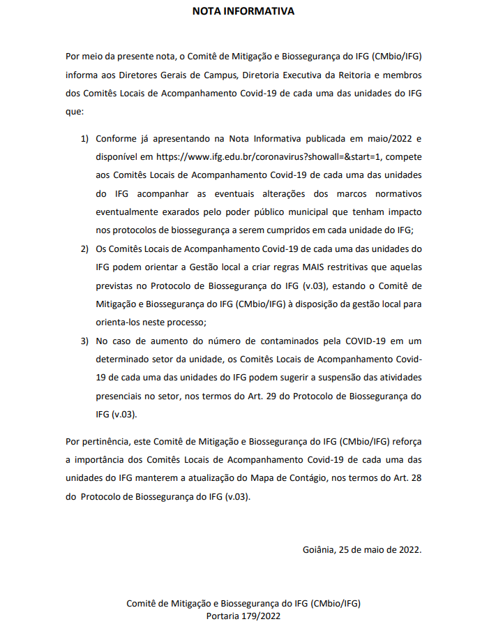 O Comitê de Mitigação e Biossegurança do IFG (CMbio/IFG) publicou no dia 25 uma nota informativa sobre a possibilidade de criação de regras pelos Comitês Locais de Acompanhamento da Covid-19.