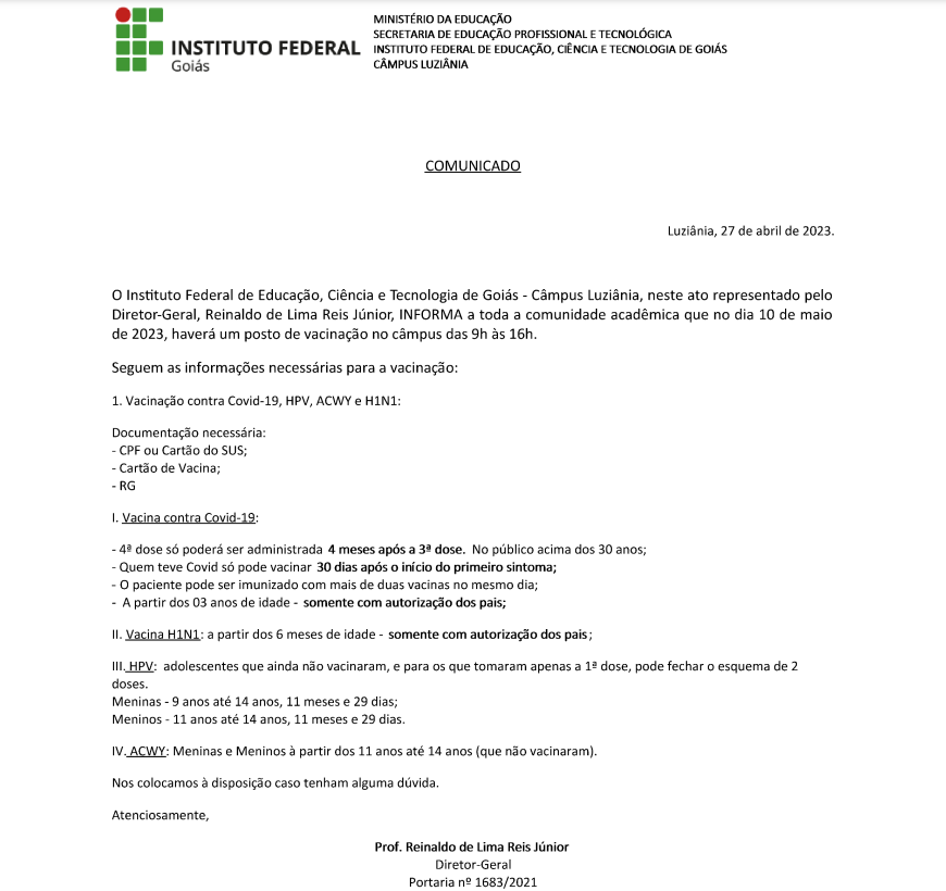 No dia 10 de maio, haverá um posto de vacinação no Câmpus Luziânia para atender alunos, servidores e comunidade em geral.