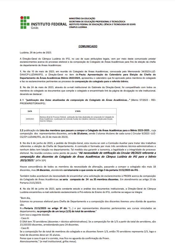 Veja o comunicado da Direção-Geral a respeito da composição do Colegiado de Áreas Acadêmicas (ACESSE AQUI):