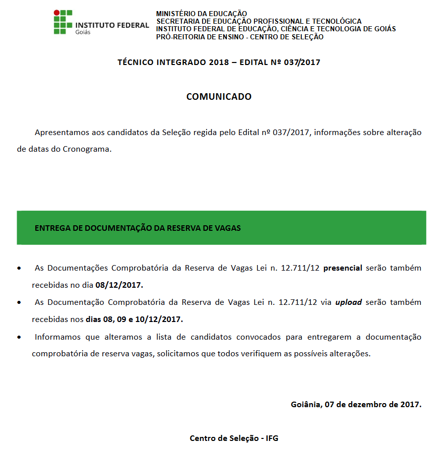 O Centro de Seleção do Instituto Federal de Goiás prorrogou o prazo para entregar a documentação comprobatória da Reserva de Vagas da seleção dos cursos técnicos integrados ao ensino médio. A entrega pode ser feita presencialmente no câmpus nesta sexta-feira, 8 de dezembro, ou pela internet, até 10 de dezembro, pelo link: http://selecao.ifg.edu.br/recurso/?cod=1294@1234&etapa=10