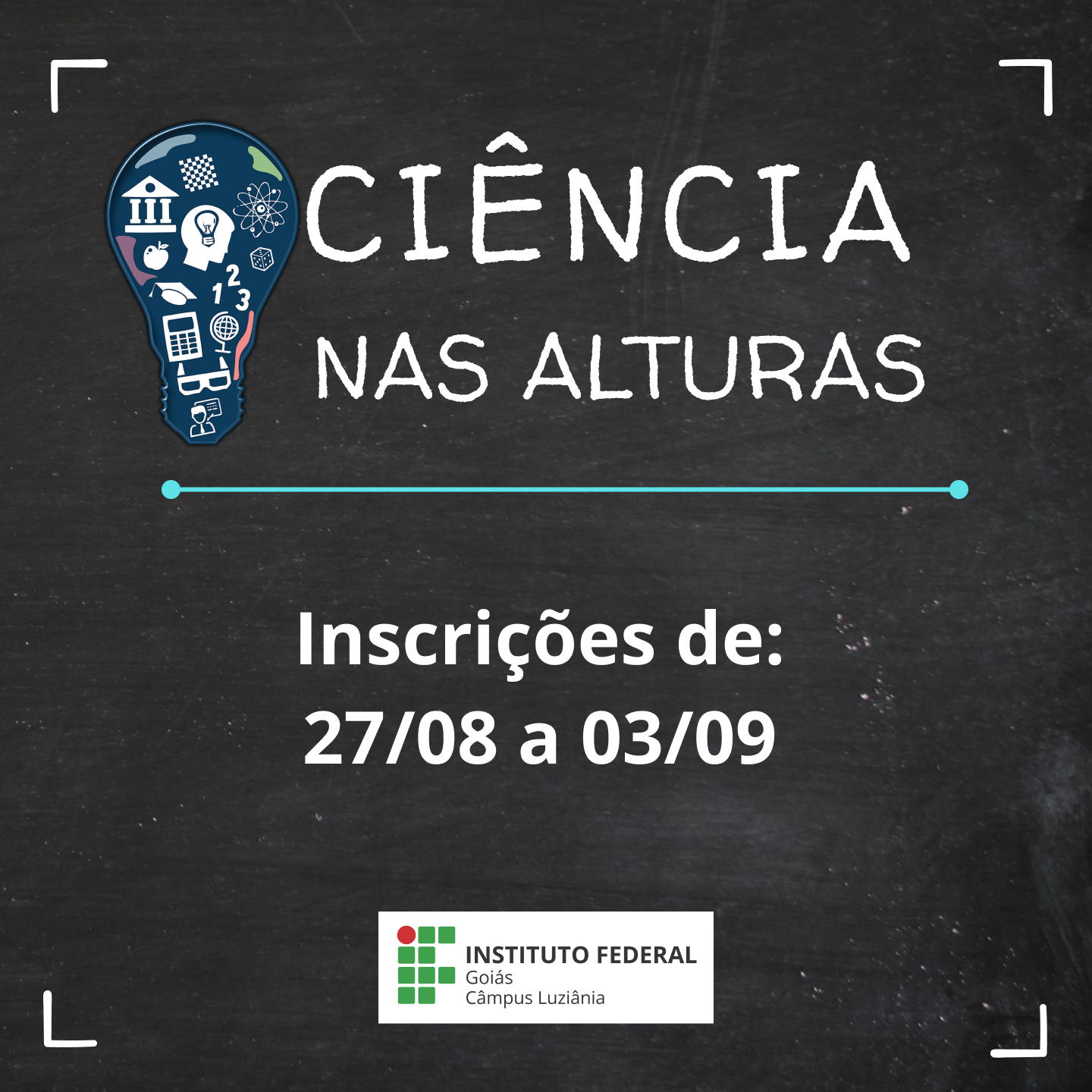 Ciências nas alturas: seminário local e mostra de extensão. Inscrições abertas de 27/08 a 03/09 Maiores informações em: https://www.even3.com.br/cienciasnasalturas2021/