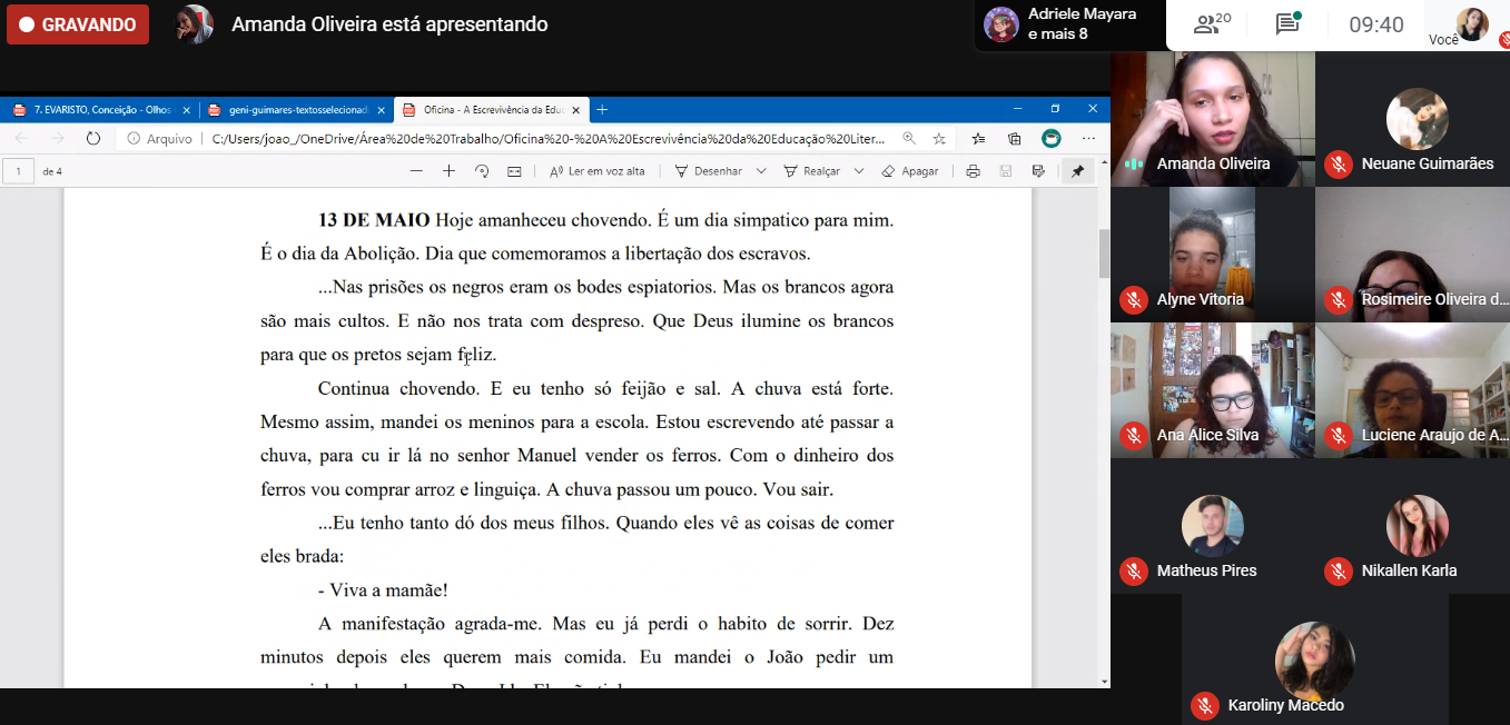 Falando da escritora Carolina de Jesus e da obra Quarto de despejo: diário de uma favelada, a estudante Amanda Oliveira fez da sua fala um convite para que outras pessoas conheçam mais sobre a escritora e sua obra, e não só ela, mas outras escritoras também, como Conceição Evaristo, por exemplo, que é a responsável por cunhar o termo “escrevivência”.