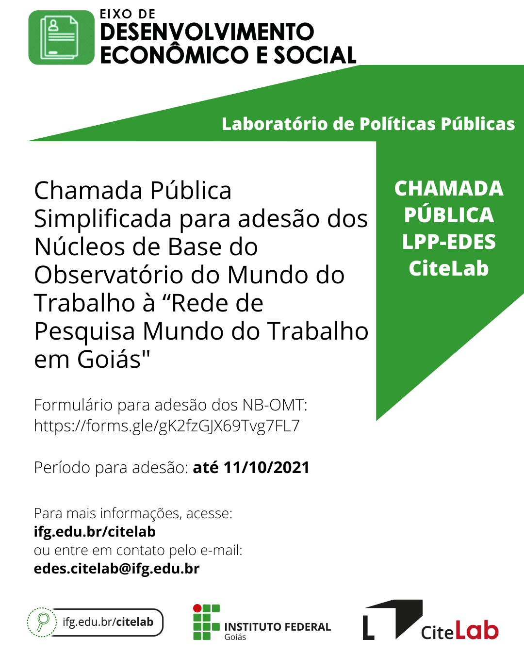 O Laboratório de Políticas Públicas, que compõe o Eixo de Desenvolvimento Econômico e Social do CiteLab/IFG, divulga sua primeira chamada pública. Trata-se da Chamada Pública Simplificada Nº 01/2021, que tem como objetivo principal promover a adesão dos Núcleos de Base do Observatório do Mundo do Trabalho do IFG à “Rede de Pesquisa Mundo do Trabalho em Goiás”, uma parceria do Laboratório de Políticas Públicas EDES/CiteLab/IFG e da Coordenação do Observatório do Mundo do Trabalho do IFG.