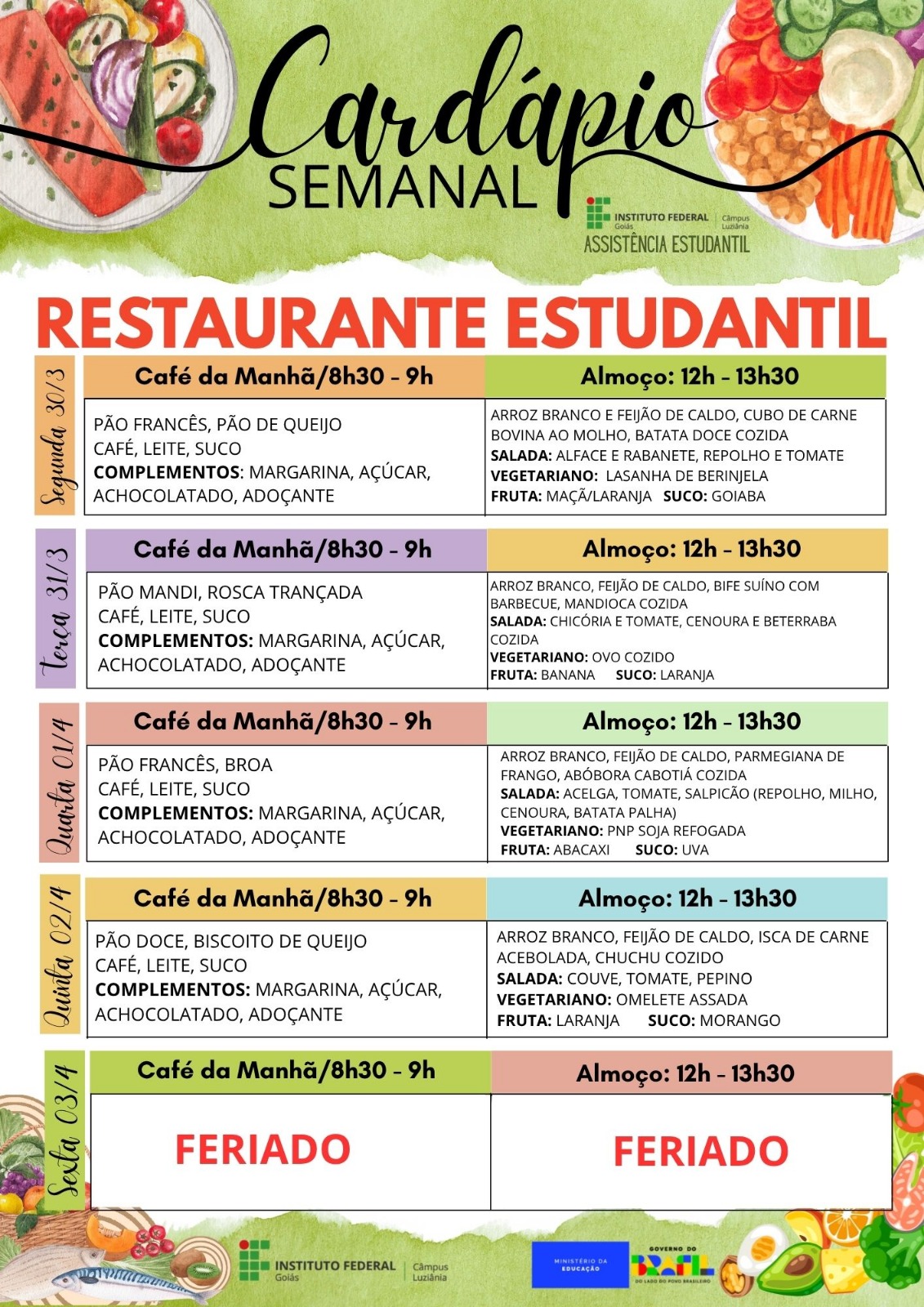 Cardápio da semana (30/03 a 02/04/2026):