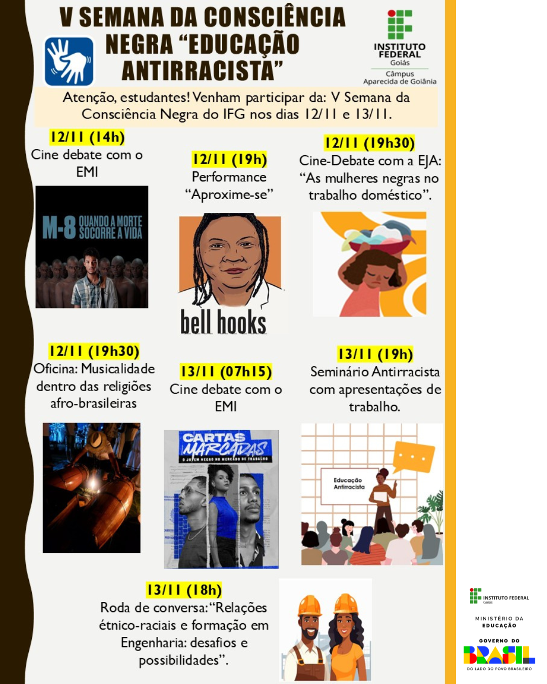 O Núcleo de Estudo e Pesquisa de Políticas de Igualdade Racial e de Gênero (NEABI) e a Comissão Permanente de Políticas de Promoção da Igualdade Étnico-Racial (CPPIR) do IFG - Câmpus Aparecida de Goiânia convida a comunidade acadêmica para as atividades da V Semana da Consciência Negra, nesta quarta e quinta-feira, dias 12 e 13 de novembro. Estudantes do Ensino Médio Técnico...