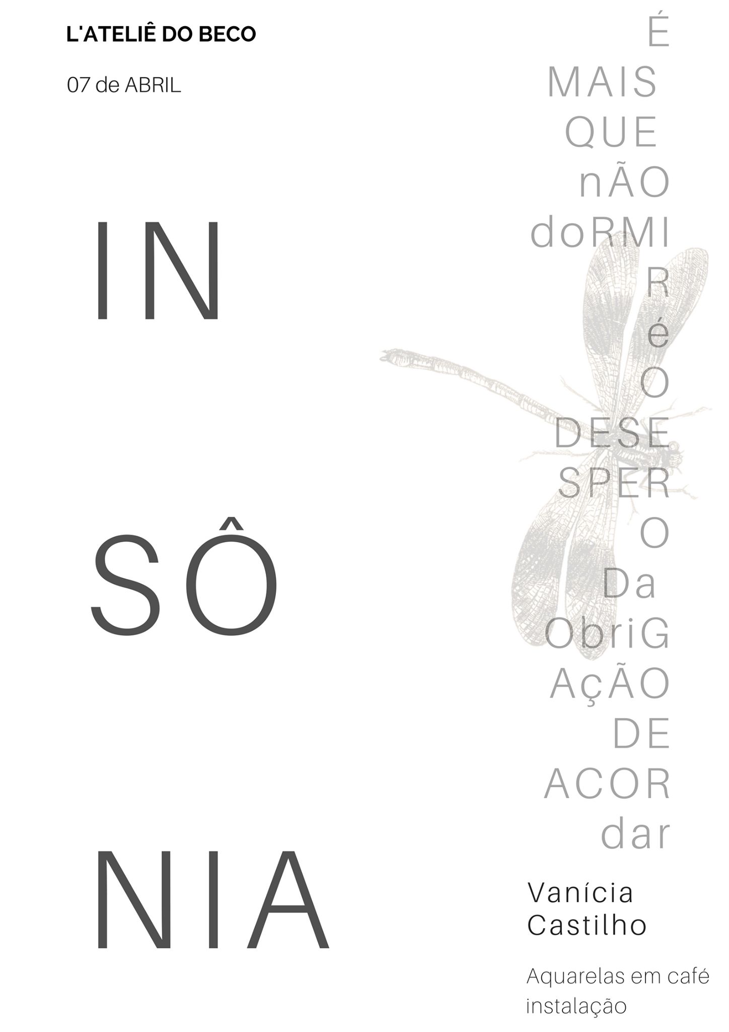 Através do primeiro contato com a aquarela, nasce a necessidade de experimentar materiais distintos e explorar temáticas que tragam não somente a técnica mas uma poética que dialogue com o processo de descobrir-se artista. Insônia é uma série de aquarelas em café e instalação que exploram a beleza e os incômodos de uma mente em processo criativo, com o intuito de falar não somente de obras expostas mas também de artista que se expõe e tenta trazer para as obras a perturbação e a delicadeza de descobrir-se um ser que cria através de suas vivências.