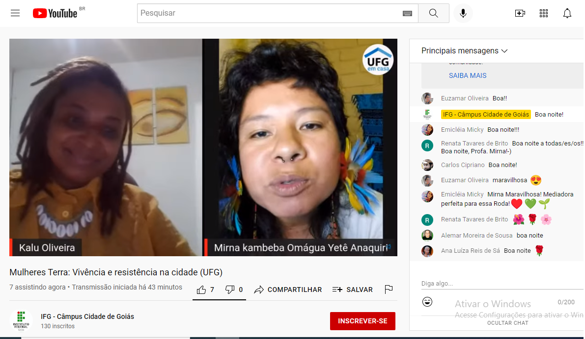 “Estar na cidade só afirma mais quem nós somos, porque aqui não podemos nos esquecer um só minuto quem somos, a luta de reafirmação de nossa identidade é constante”, foi assim que Evelin Tupinambá sintetizou sua vivência na cidade ao relatar sua experiência no "Encontro Mulheres Terra: vivências e resistências na cidade” transmitido ontem, dia 24/11, simultaneamente pelo canal do YouTube do IFG-câmpus Cidade de Goiás e da Universidade Federal de Goiás (UFG).