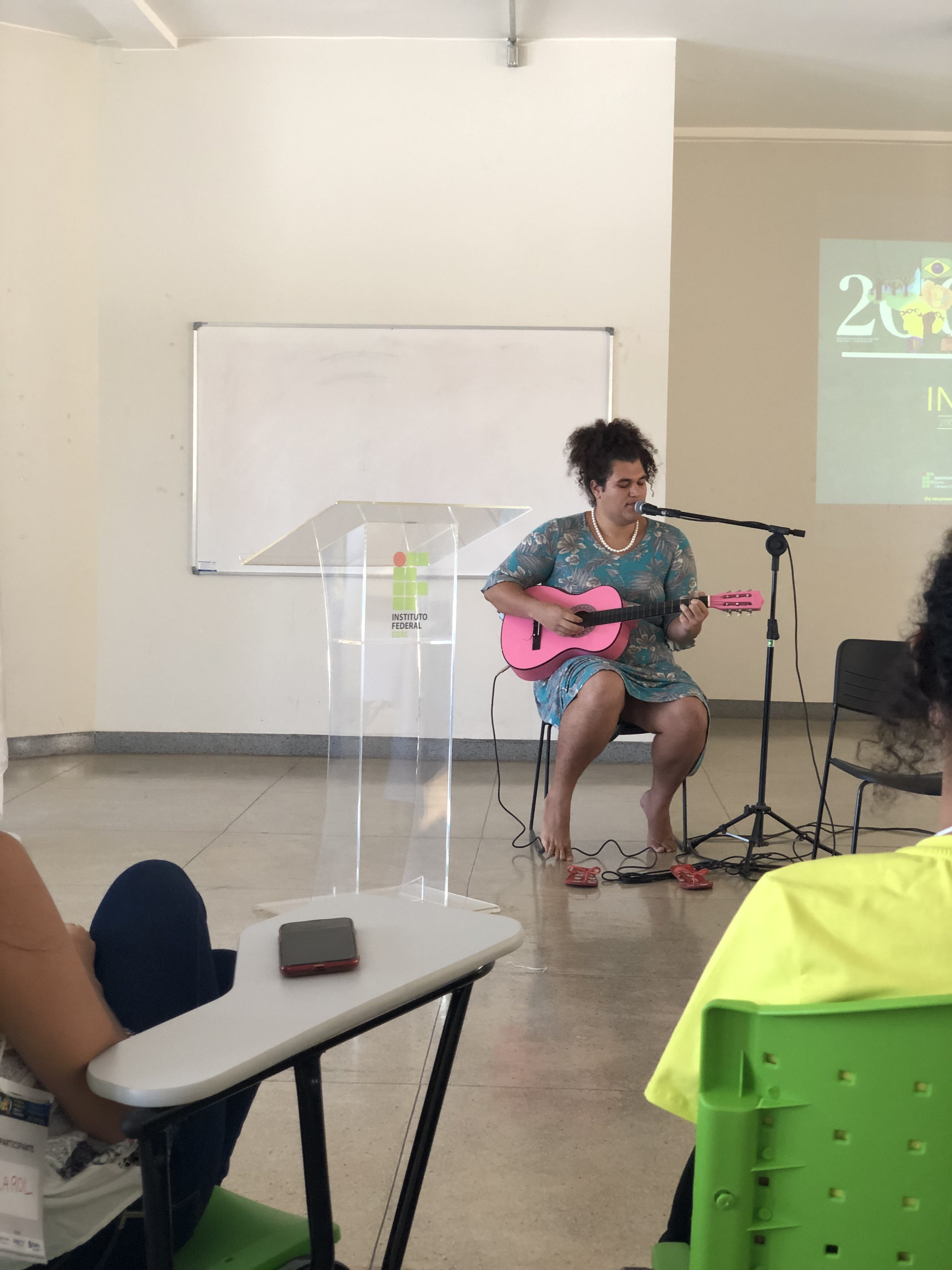 As estudantes Helena Caetana (Bacharelado em Cinema) e Iracema (Técnico Integrado em Produção de Áudio e Vídeo) fizeram apresentações musicais antes do início da primeira roda de conversa do evento que contou com a participação dos servidores Rômulo Sousa e Cláudia Trindade e da convidada Lízia de Oliveira. O tema da mesa foi “A ciência enquanto espaço de diagnóstico e luta para o enfrentamento da desigualdade educativa e pela inclusão social: uma educação “igual”, num espaço comum para pessoas diferentes”.
