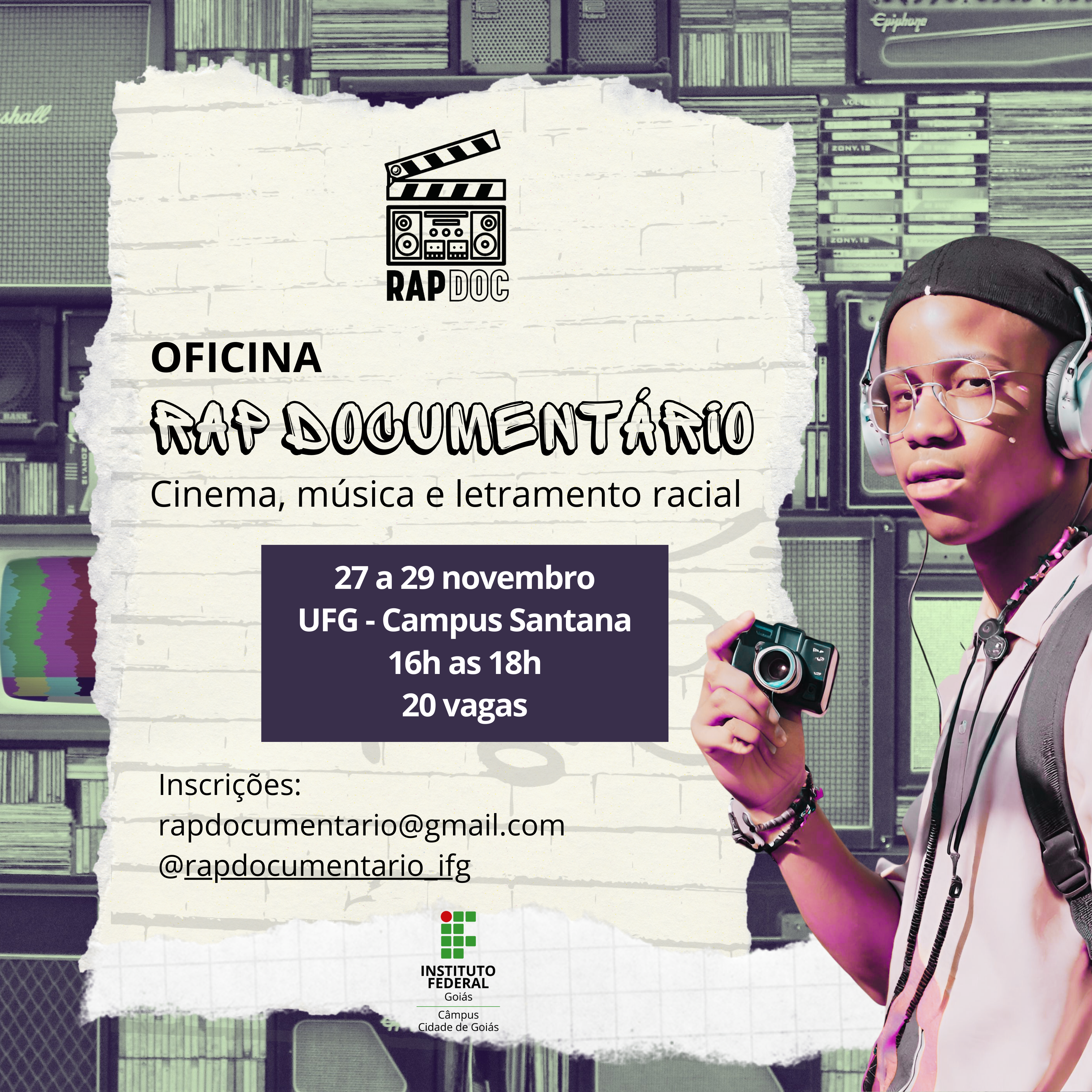 O projeto de extensão "Rap Documentário - cinema, música e letramento racial", coordenado pelo professor Antônio Fabrício participa da programação "Novembro da Consciência Negra" promovido pela Prefeitura da Cidade de Goiás, por meio da Secretaria de Políticas de Promoção da Igualdade e Equidade Étnico-Racial. Será ofertada oficina para a comunidade externa entre os dias 27 a 29 de novembro das 16h às 18h na UFG - Unidade Santana. Ao todo são 20 vagas, os interessados podem se inscrever enviando e-mail para: rapdocumentario@gmail.com.