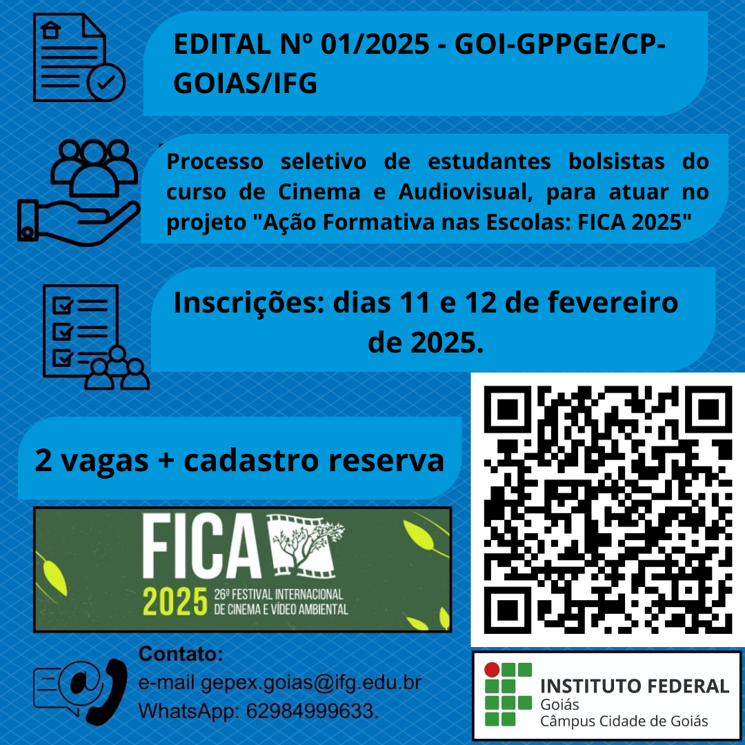 A Gerência de Pesquisa e Extensão do IFG - câmpus Cidade de Goiás tornou público o edital para Processo Seletivo para preenchimento de vagas destinadas a estudantes do curso de Bacharelado em Cinema e Audiovisual que atuarão no projeto "Ação Formativa nas Escolas: FICA 2025". São duas vagas imediatas e quatro vagas para formação de cadastro de reserva. O valor da bolsa é de R$ 700,00, a atuação dos bolsistas será de fevereiro a maio, totalizando quatro parcelas da bolsa.