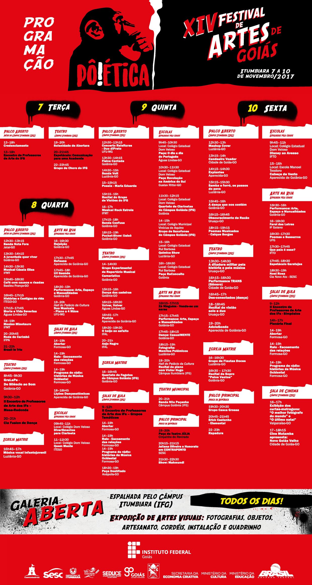 Começa nesta terça-feira, 7 de novembro, mais uma edição do Festival de Artes. Promovido pelo Instituto Federal de Goiás, por meio de sua Pró-Reitoria de Extensão, o evento que é um dos maiores na área de arte e cultura do Estado de Goiás já está em sua XIV edição e será realizado no Câmpus Itumbiara. Para esta edição, estão programadas mais de 120 atrações, entre oficinas, palestras, apresentações de música, dança, teatro e exposições.