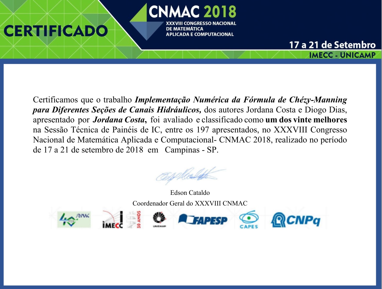 O evento, realizado em Campinas/SP, entre os dias 17 e 21 de setembro, é o mais importante da Sociedade Brasileira de Matemática Aplicada e Computacional (SBMAC) e reúne professores, pesquisadores e profissionais, de universidades, centros de pesquisa e empresas, das mais diversas áreas da Matemática Aplicada e Computacional, para divulgar e discutir os resultados (conclusivos e em desenvolvimento) das suas pesquisas e da produção científica nas principais instituições nacionais. O orientador do projeto de Iniciação Científica da aluna do IFG, professor Diogo Gonçalves Dias, explica que a aluna levou dois projetos para o CNMAC 2018, e que foi motivo de muito orgulho saber que um deles, o que trata sobre canais hidráulicos, foi tão bem recebido pelos avaliadores desta trigésima oitava edição do Congresso.