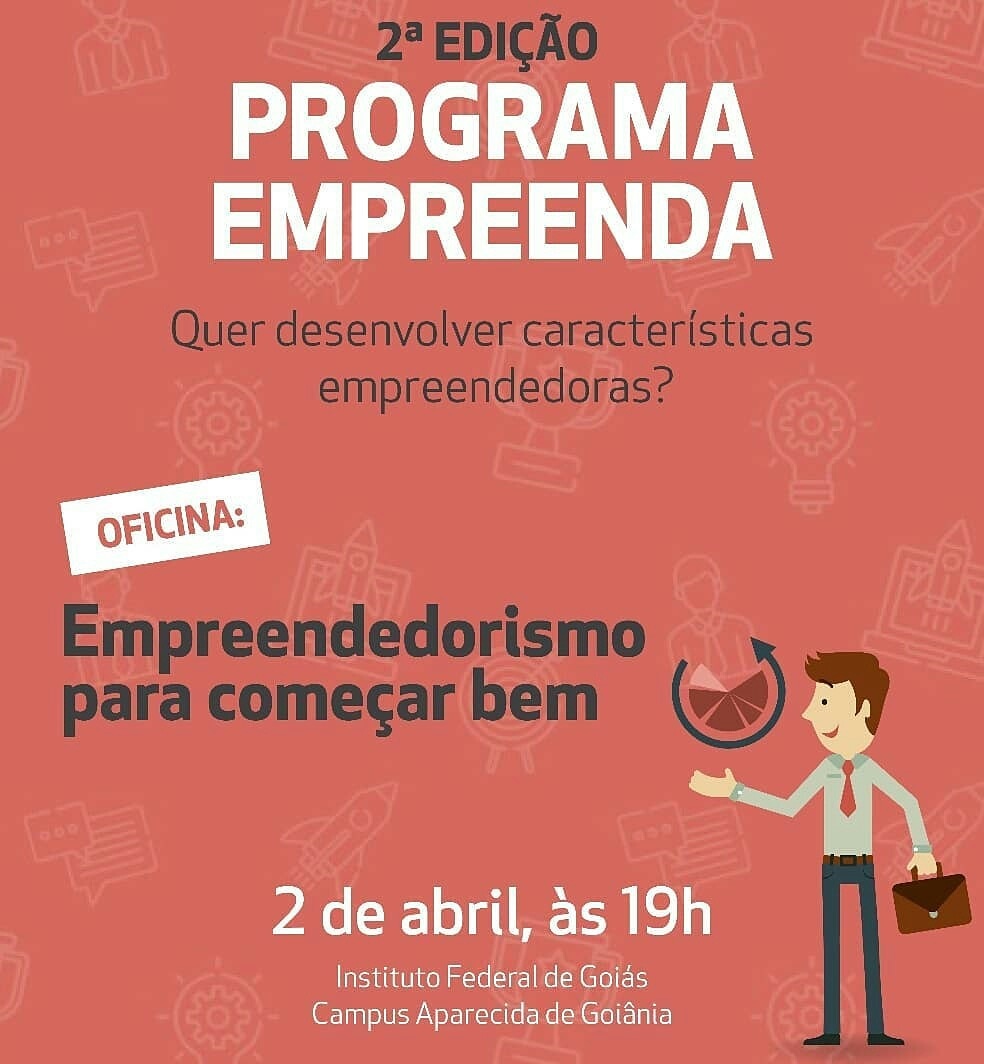 O Centro de Inovação Tecnológica (Cite) do Instituto Federal de Goiás (IFG) vai desenvolver o Programa Empreenda, com atividades que começam no dia 2 de abril e se estendem até setembro, no Câmpus Aparecida de Goiânia, numa parceria com Programa de Incubação de Empresas do Município de Aparecida de Goiânia (Incubadora 3D). As inscrições, que são gratuitas, estão abertas e deve ser feitas somente pela internet, na página do Sistema Unificado de Gestão de Extensão e Pequisa (Sugep) do IFG.