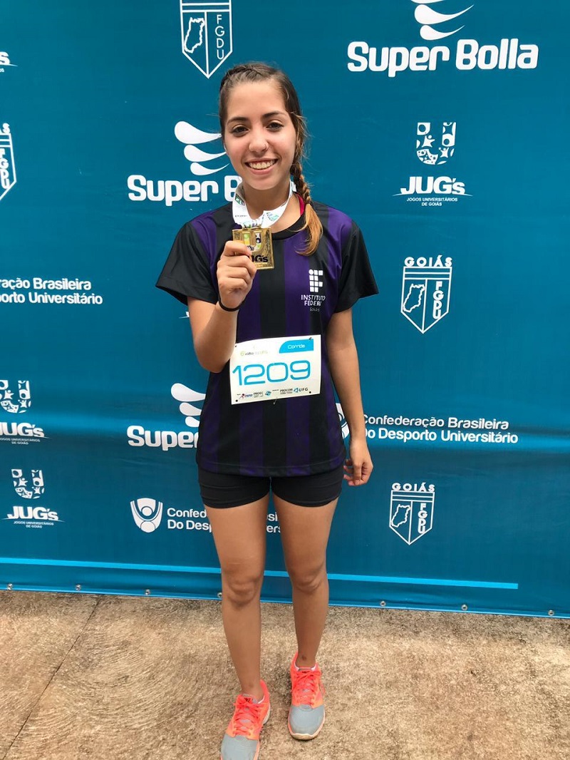 A marca vitoriosa em participação e medalhas no Atletismo para o Câmpus Aparecida de Goiânia do IFG permanece com estudantes de graduação que conheceram a modalidade esportiva nas aulas de Educação Física do câmpus e fizeram suas primeiras competições no JIF. É o caso das estudantes Derliyl Ohanna Gabrieliy Jocilia Ferreira Evangelista (foto), Suzana Chediak de Sousa e Taynara Coutinho, medalhistas dos Jogos Universitários de Goiás 2019, realizado de 17 a 21 de abril, e participantes da etapa nacional dos JUGs, marcada para o mês de outubro na cidade de Salvador (BA).