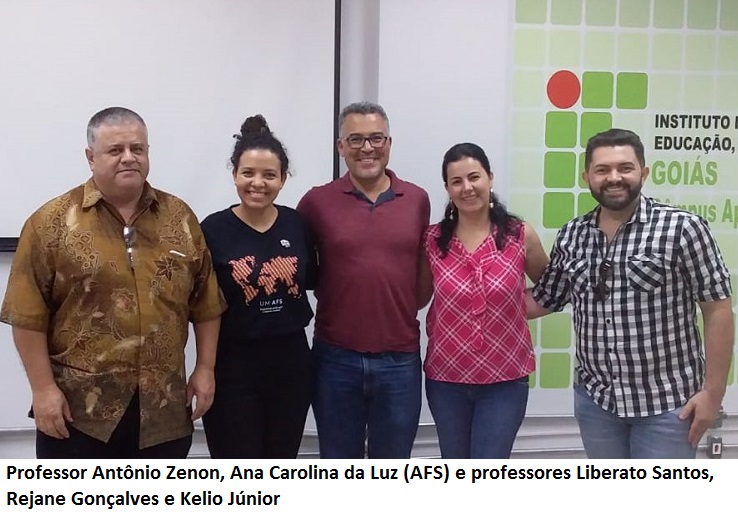 O AFS é uma organização não governamental e sem fins lucrativos, que começou a atuar no Brasil na década de 50. A atividade sobre intercâmbio no IFG Aparecida foi organizada pela representante do programa Idioma sem Fronteiras (ISF/MEC) no câmpus e representante local da Coordenação de Relações Internacionais do IFG, professora Rejane Maria Gonçalves Maia, que ministra a disciplina de Língua Inglesa. Ela avalia que a roda de conversa se configurou como uma importante ação de internacionalização, por ter favorecido a discussão sobre intercâmbio entre os estudantes. “É oportunidade de ampliar o horizonte e a formação educacional/profissional ao se considerar oportunidades para além das fronteiras do país”, afirmou.