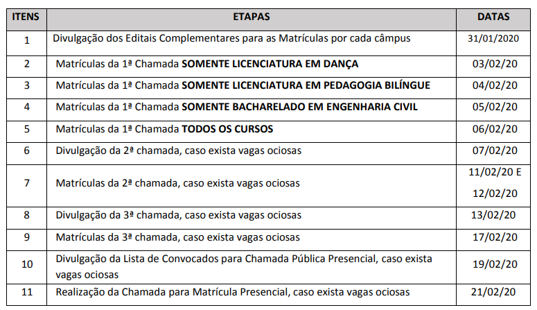 Editais complementares apresentam as orientações, por câmpus, das datas e horários para realização das matrículas