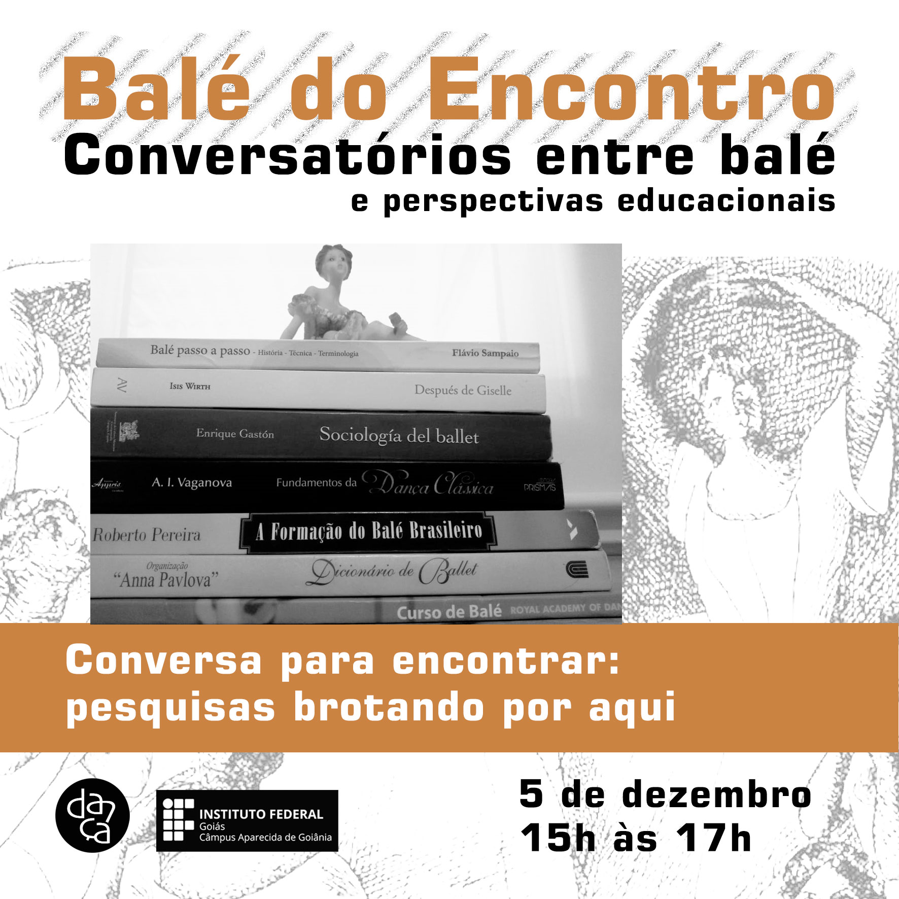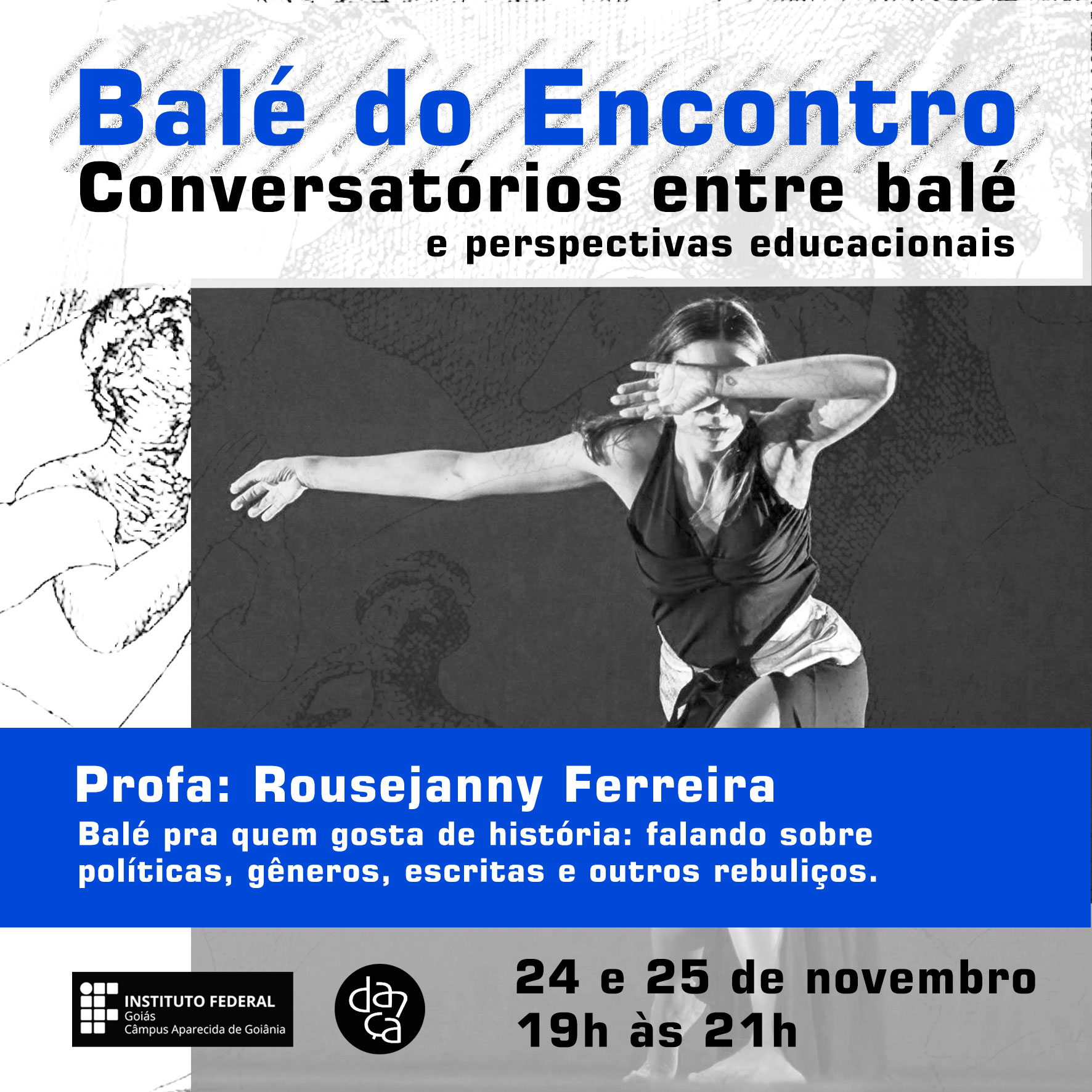 Começa neste sábado, 21 de novembro, a série de ações Balé do Encontro - Conversatórios entre balé e perspectivas educacionais. Coordenada pela professora Rousejanny da Silva Ferreira, do curso de Licenciatura em Dança do IFG - Câmpus Aparecida de Goiânia, a iniciativa teve projeto aprovado pelo edital Inspirarte, do IFG, com o objetivo de fomentar diálogos para reflexões entre a formação de professores de dança, a estética do balé, a infância e pesquisa., mesmo em tempos de isolamento social.