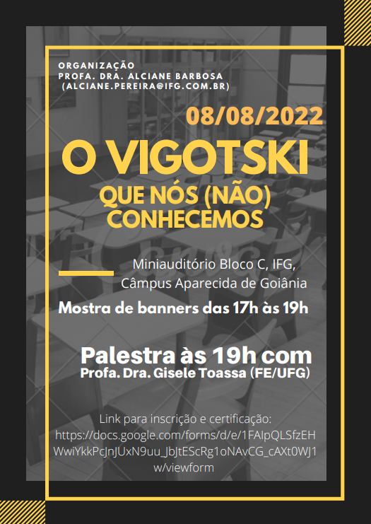 Um dia para conhecer um pouco mais o pensamento do psicólogo Lev Vigotski, considerado um dos principais teóricos da pedagogia contemporânea, será proporcionado a estudantes, professores e demais pessoas interessadas, por meio da mostra “O Vigotski que nós (não) conhecemos”, que vai integrar palestra e exposição de banners no IFG - Câmpus Aparecida de Goiânia. O evento, a ser realizado na segunda-feira, dia 8 de agosto, foi organizado pela disciplina optativa “Psicologia Histórico-Cultural”, sob responsabilidade da professora Alciane Barbosa Macedo Pereira, no curso de Licenciatura em Pedagogia Bilíngue do IFG. Alciane é organizadora das duas atividades. Para se inscrever basta clicar aqui ou entrar pelo Sugep: https://sugep.ifg.edu.br/eventos/