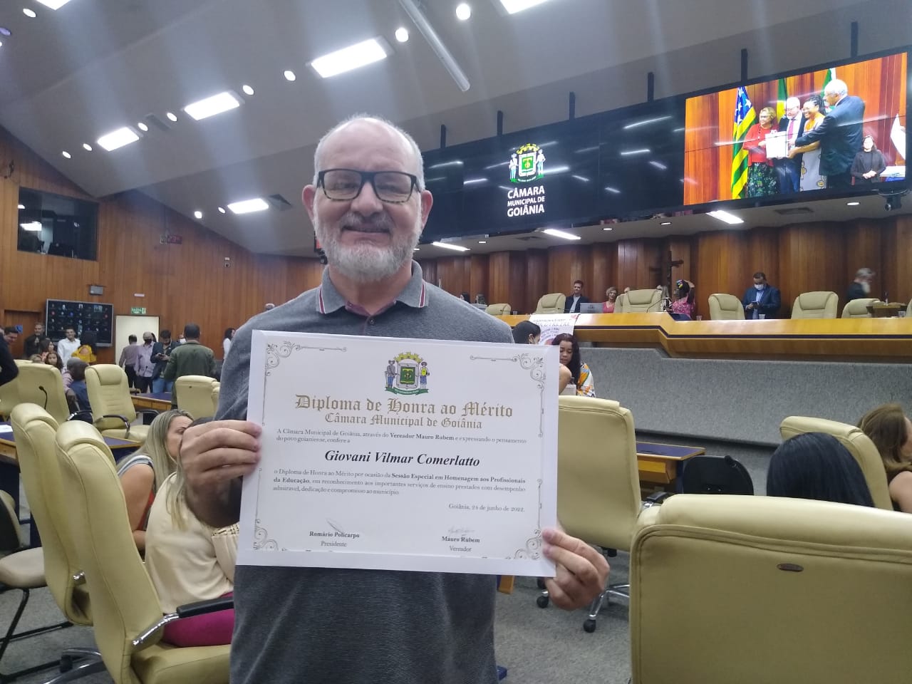 O enfrentamento das desigualdades sociais no país por meio da EJA conferiu recentemente ao professor Giovani Comerlatto um Diploma de Honra ao Mérito, pelo trabalho no IFG. A honraria foi concedida no dia 24 de junho, em Sessão Especial aos profissionais da Educação na Câmara Municipal de Goiânia. Entre os educadores homenageados, estava também a reitora do Instituto Federal de Goiás, professora Oneida Cristina Gomes Barcelos Irigon.