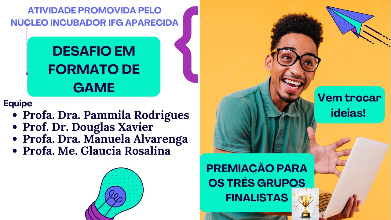 Você está aqui: Página inicial > Editais > Pesquisa e Inovação - Em andamento > IFG > Câmpus > Aparecida de Goiânia > Notícias do Câmpus Aparecida de Goiânia > Abertas inscrições para estudantes do IFG Aparecida participarem do “Desafio Empreendedor”