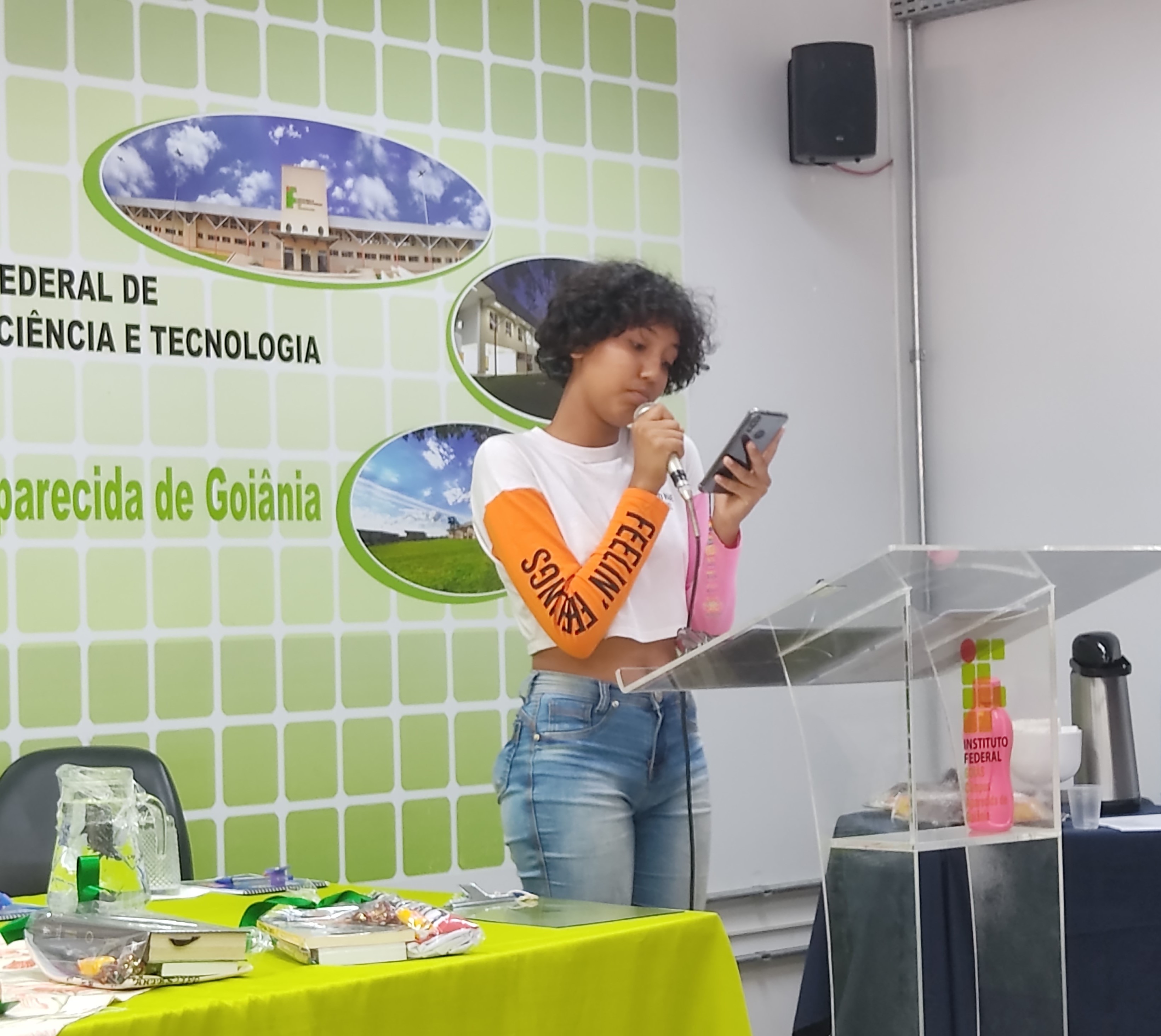 A primeira apresentação do dia foi um vídeo da filósofa Camila Villas Boas Ribeiro, interpretando o poema “A leitura, uma necessidade da alma”, de autoria de Délia Steinber Gúzman. O vídeo havia marcado também a abertura da II Semana Nacional do SIB/IFG. As apresentações da comunidade acadêmica do IFG Aparecida tiveram início com a dupla de dançarinos Wanderson dos Santos e Karitha Lauany, dos cursos técnicos integrados em Alimentos e em Química, respectivamente. Eles dançaram ao som da música “When the party’s over”, de Billie Eilish.