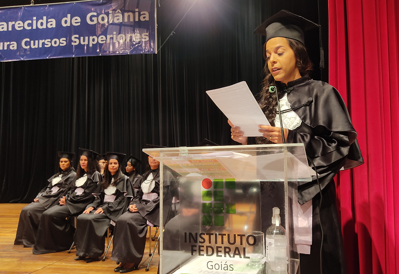 Pronunciando-se em nome das formandas dos dois cursos, a oradora Lourdes Fernandes de Lima agradeceu a Deus pela “direção e proteção”, ao IFG pela oportunidade que tiveram de estudar em uma instituição pública e agradeceu professores e coordenadores de curso pelos ensinamentos e “acolhimento sensível”. Lourdes agradeceu também a comunidade surda pelas trocas e partilha de conhecimentos. Ela destacou que novas graduadas tiveram uma formação que contemplou pesquisa, cientificidade e arte, que as levaram ao conhecimento e à sensibilidade necessários para trabalhar na missão de educar. A oradora citou Paulo Freire, destacando serem imprescindíveis na educação, o respeito ao outro, a reflexão crítica sobre a prática e a consciência do inacabamento.