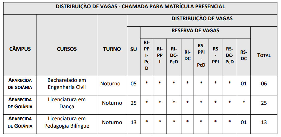 O Centro de Seleção do IFG - Câmpus Aparecida de Goiânia publicou nesta quarta-feira, dia 8 de março, o edital complementar de Chamada para Matrícula Remota do Vestibular ENEM 2023/1, para o preenchimento de vagas nos cursos de Bacharelado em Engenharia Civil, Licenciatura em Dança e Licenciatura em Pedagogia Bilíngue, num total de 44 vagas. Todos os candidatos inscritos e selecionados no processo seletivo Vestibular ENEM podem realizar a inscrição para matrícula no site do IFG até o dia 12 de março, fazendo upload da documentação no endereço http://www.ifg.edu.br/estudenoifg. A lista de convocados da Chamada para Matrícula Remota está disponível no edital.