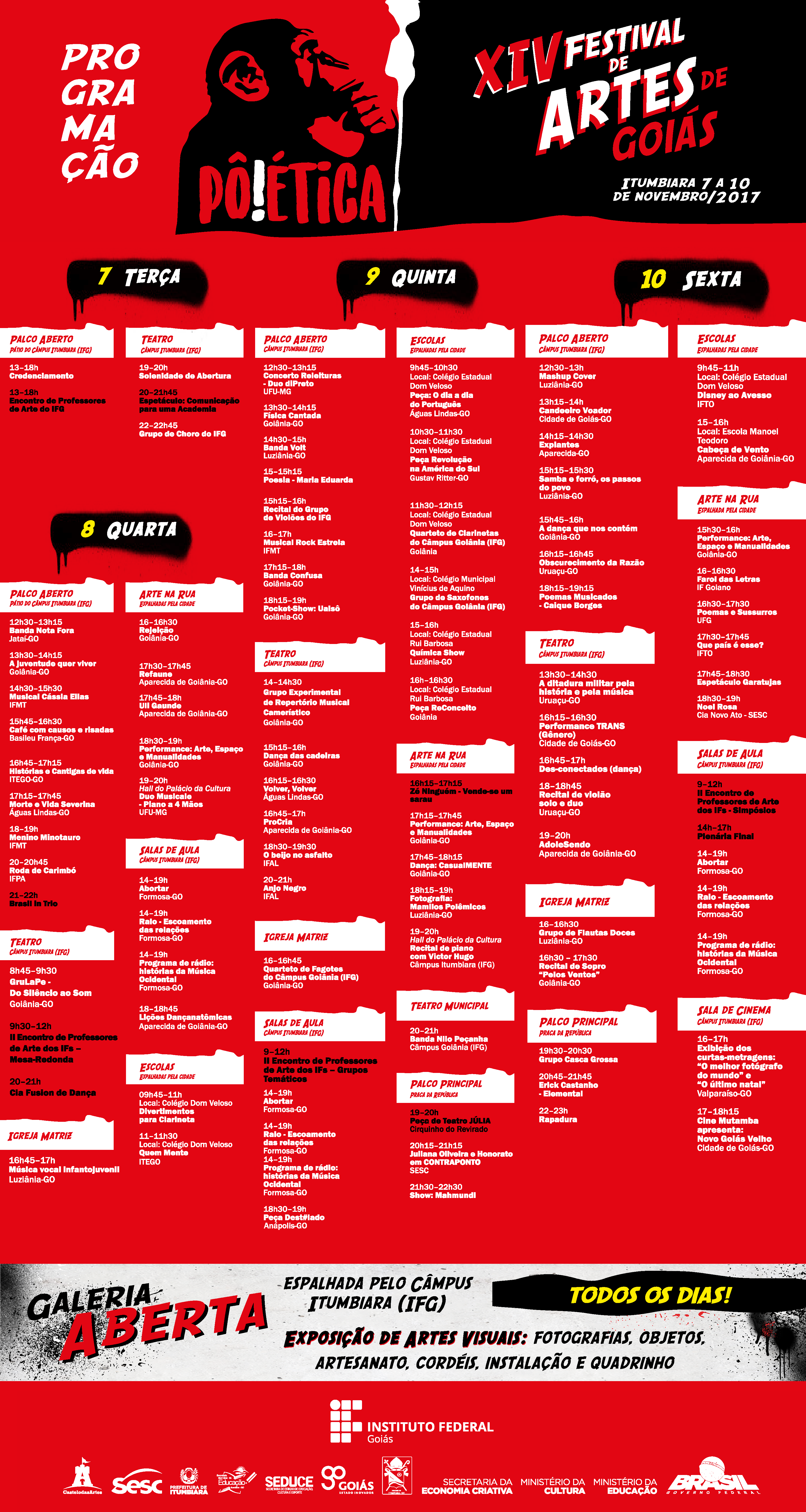 Professores do Câmpus Aparecida de Goiânia do IFG e dezenas de alunos estão abrilhantando a XIV edição do Festival de Artes com trabalhos em Dança e em Artes Visuais. O câmpus conta com 17 produções na programação oficial do evento, sendo quatro trabalhos acadêmicos para exposição oral, seis apresentações de dança, uma apresentação de videodança, uma lição em dança, duas oficinas e três trabalhos de artes visuais. A presença de estudantes como expectadores também está bastante ativa, com a partida de um ônibus por dia de Aparecida de Goiânia para Itumbiara, levando alunos que foram sorteados para participar do Festival.