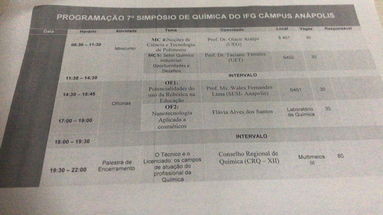 Teve início nesta quarta-feira, 7 de novembro, o 7º Simpósio de Química do Instituto Federal de Goiás (IFG) - Câmpus Anápolis. O primeiro dia do evento contou com a participação de renomados docentes da área em três palestras, uma mesa redonda e dois minicursos. Também foram promovidas uma apresentação de pôsters e uma atração musical. O Simpósio tem o seguinte tema: “Formação de potencialidades nas áreas de atuação dos profissionais de Química”. A programação segue até amanhã, 8 (veja aqui).