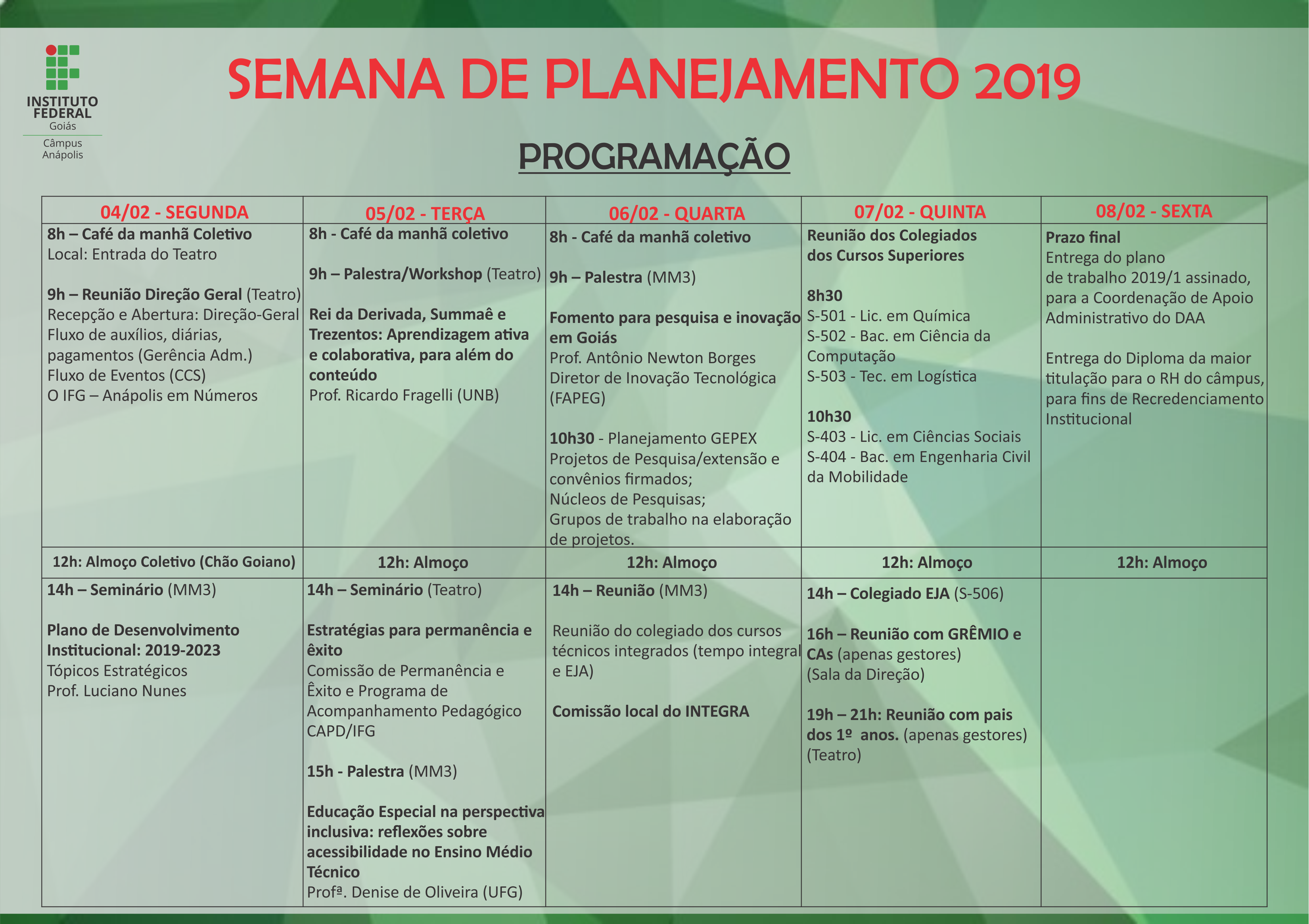 Começa na próxima segunda-feira, 4, a Semana de Planejamento Pedagógico 2019 do Instituto Federal de Goiás (IFG) – Câmpus Anápolis. O evento envolve toda a equipe de servidores do IFG especialmente os que são ligados à área de ensino. Além de professores e técnicos administrativos, a Semana também abrigará espaços para reuniões com representantes de entidades estudantis do IFG e com pais dos alunos ingressantes no ensino médio. Confira a programação completa aqui.