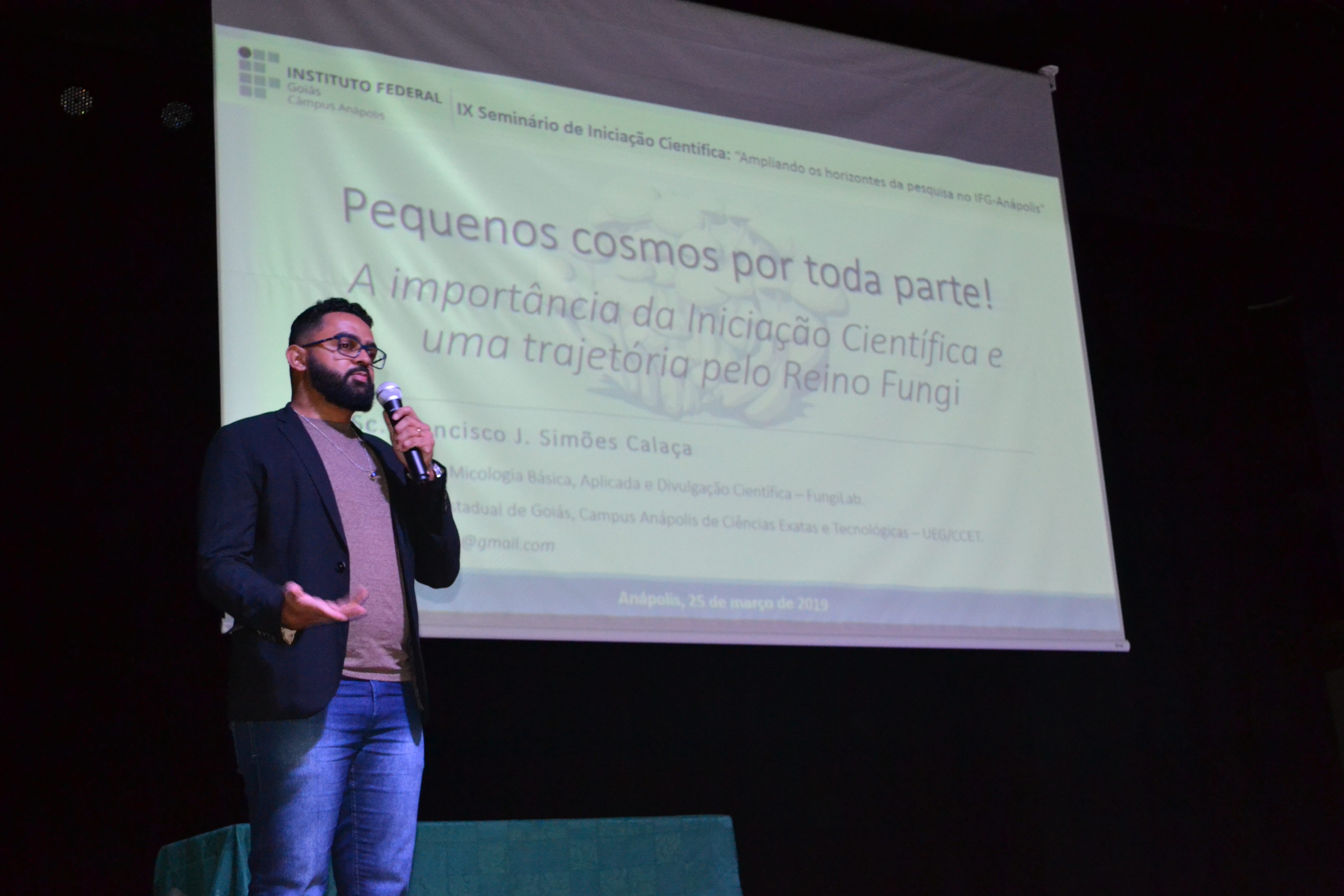O Câmpus Anápolis do Instituto Federal de Goiás (IFG) realizou hoje, 25, o primeiro dia do seu IX Seminário de Iniciação Científica. Ao longo do dia, foram promovidas apresentações orais dos trabalhos que estão sendo desenvolvidos por estudantes e professores do Câmpus. À noite, a atração cultural ficou por conta da Banda Lira de Prata de Sant’ana e em seguida foi realizada a palestra de abertura com o professor Francisco Júnior Simões Calaça que tratou do seguinte tema: “Pequenos Cosmos por toda parte: a importância da iniciação científica e uma trajetória pelo reino Funji”.
