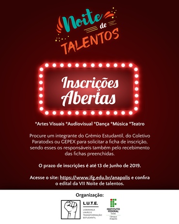 A Noite de Talentos é um evento composto de apresentações artísticas de alunos, servidores e egressos do IFG Anápolis e que tem por objetivo, entre outros, a integração entre os que compõem a comunidade do Câmpus por meio de manifestações artísticas, além de divulgar diferentes linguagens artísticas. Podem participar alunos, servidores e egressos, individualmente ou em grupos, nas categorias Artes Cênicas, Artes Visuais, Audiovisual, Dança, Literatura, Música e Talentos Diversos. Pessoas da comunidade externa também podem participar, desde que integrem grupos em que pelo menos um dos integrantes seja do Câmpus. As inscrições vão até o dia 13 de junho e são gratuitas.
