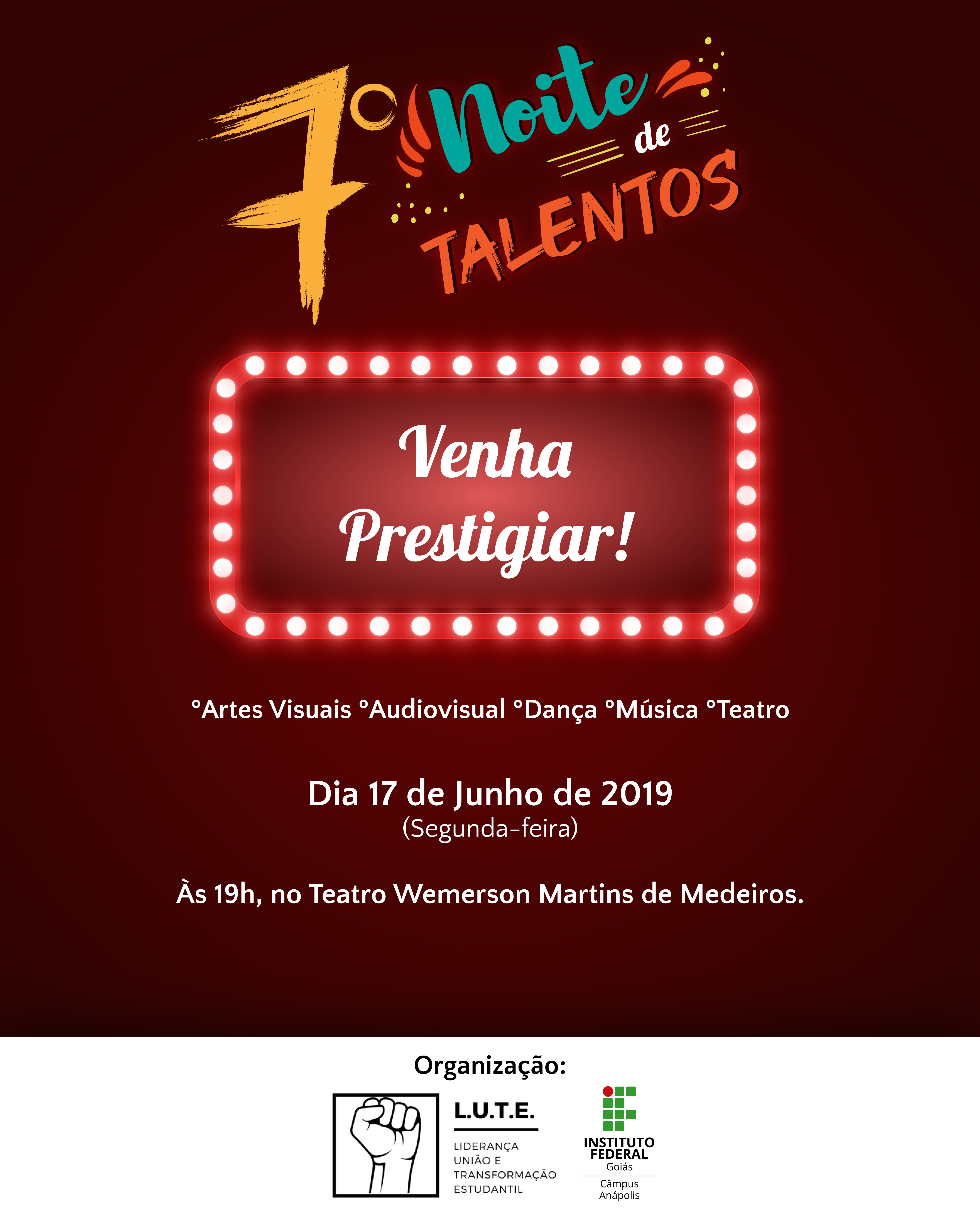Encerram-se nesta quinta-feira, 13, as inscrições para interessados em se apresentar na 7ª Noite de Talentos do IFG Anápolis. O evento integra a programação das comemorações do 9º aniversário do Câmpus e acontecerá na próxima segunda-feira, dia 17 de junho, às 19h, no Teatro. A organização está a cargo do Grêmio Estudantil União Jovem e do Coletivo Paratodxs. As inscrições são gratuitas e o regulamento pode ser acessado aqui.