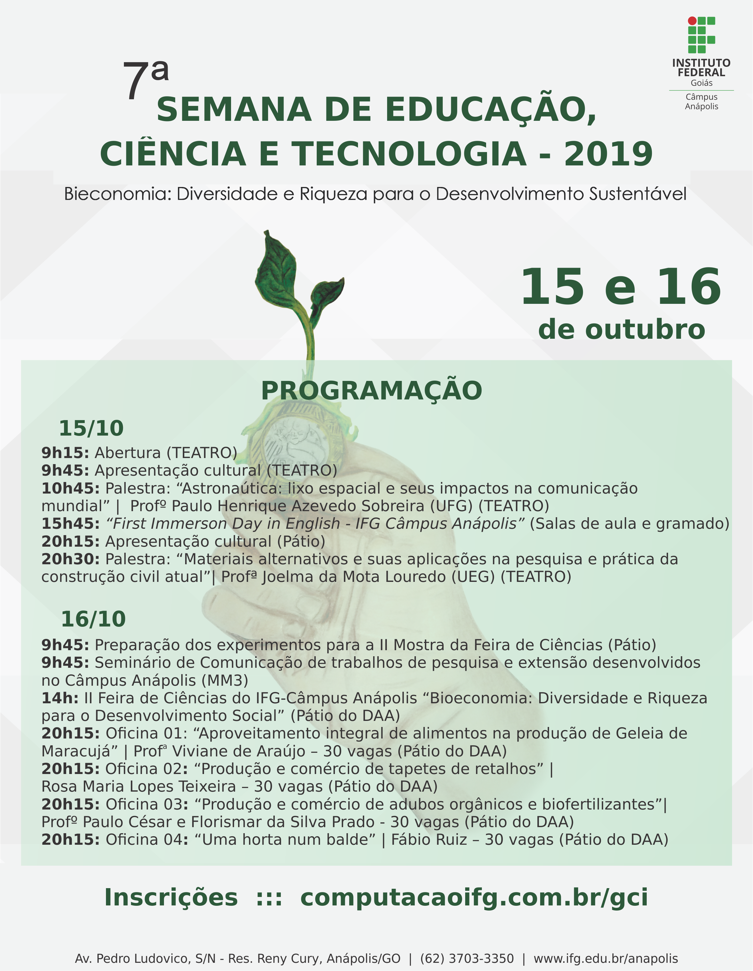 A Gerência de Pesquisa e Pós-graduação e Extensão (Gepex) do IFG Anápolis divulgou a programação da 7ª Semana Nacional de Educação, Ciência e Tecnologia – Secitec –, que será realizada em 15 e 16 de outubro. A Secitec é um evento nacional, que acontece simultaneamente em instituições de ensino superior de todo o País, e este ano tem como tema: “Bioeconomia: Diversidade e Riqueza para o Desenvolvimento Sustentável”. Inscrições podem ser feitas aqui.